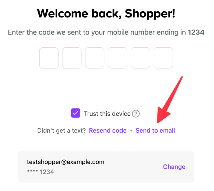 ↑ Back to topThe next time you check out on any WooPay-enabled store, we’ll recognize your email address and automatically send a six-digit verification code to your phone. You can also click the Send via Email link to receive a code in an email.