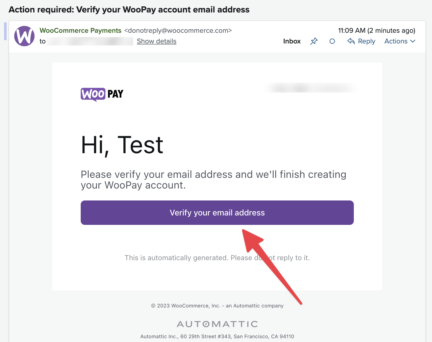 During this process, you will also receive a welcome email with some general information about WooPay. This email will also contain a Verify your email address link. Click the button to verify that you own the email address in question.
