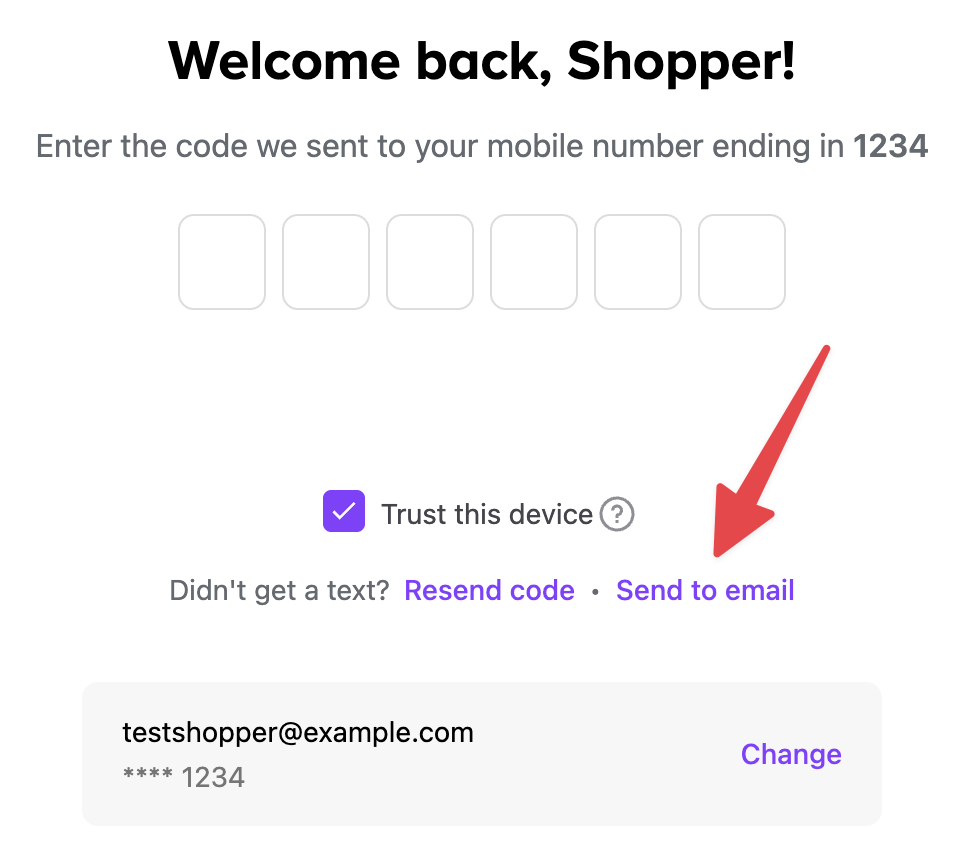 ↑ Back to topThe next time you check out on any WooPay-enabled store, we’ll recognize your email address and automatically send a six-digit verification code to your phone. You can also click the Send via Email link to receive a code in an email.