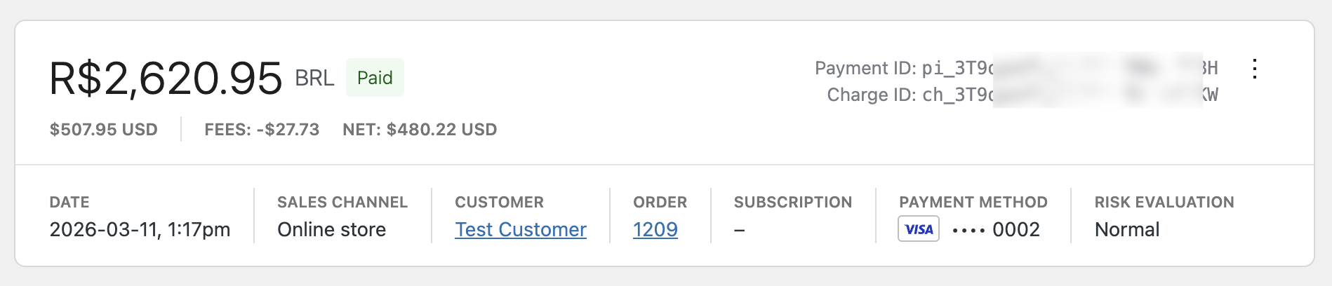 ↑ Back to topThe transaction detail page shows the amount in the customer currency at the top. Below that, that amount is converted into the payout currency and displayed alongside the fees and net amount that was (or will be) paid out.