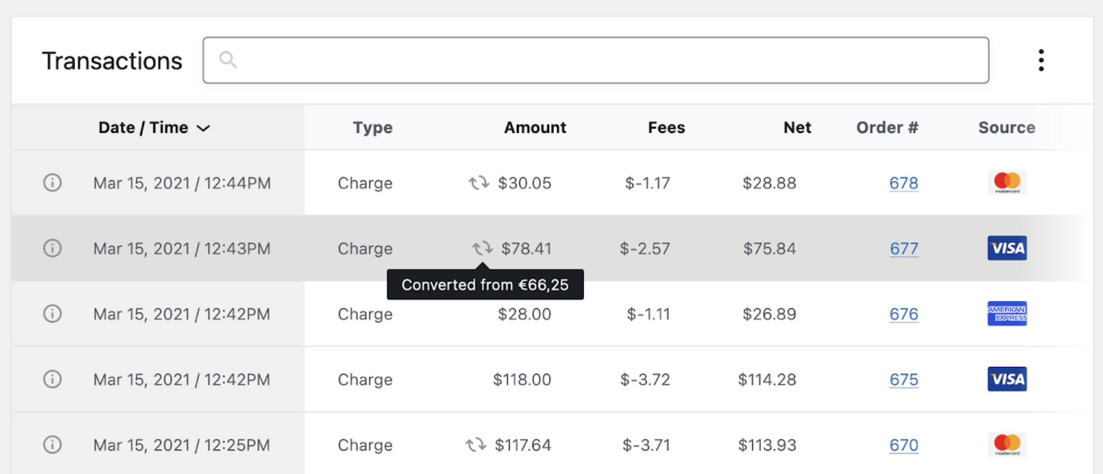 ↑ Back to topThe Payments > Transactions page lists all WooPayments transactions, regardless of currency. The amount, fees, and net amount are all displayed in the payout currency.