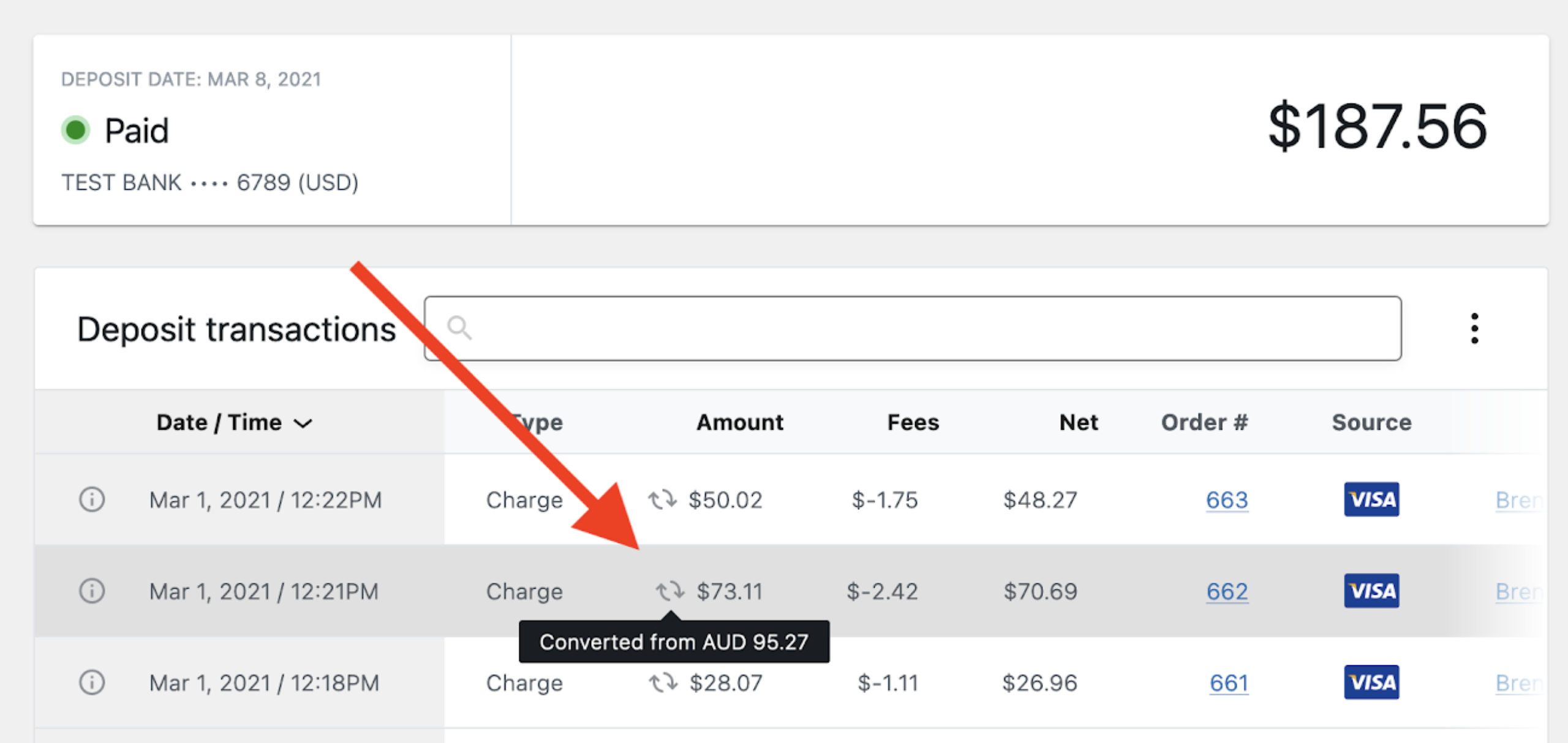 Transactions which required a currency conversion in order to be paid out have a tooltip to view the amount paid by the customer in the customer currency.