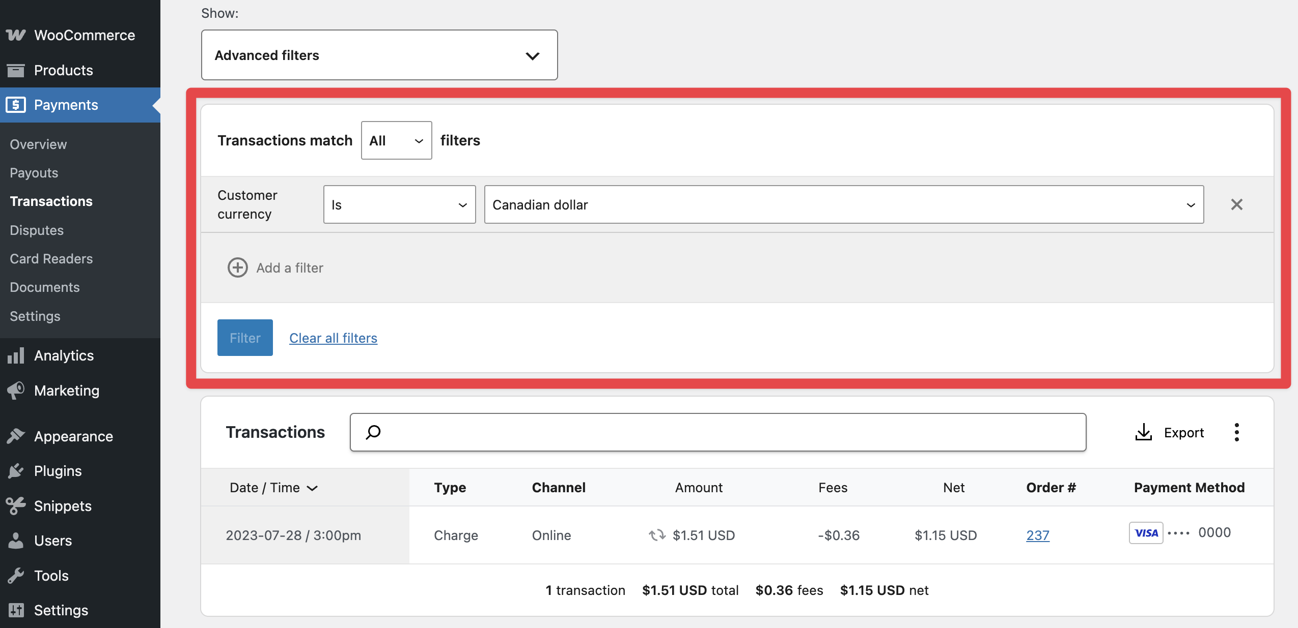 NOTE: The Transactions page only shows transaction details for orders paid for with WooPayments. It does not show information for orders paid for using other gateways you might have active on your site.