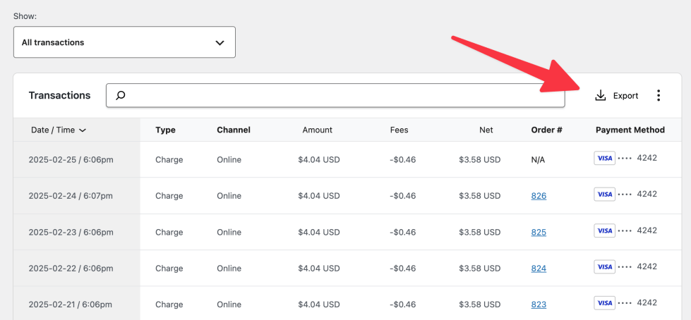 - Go to Payments > Transactions in your WordPress dashboard.