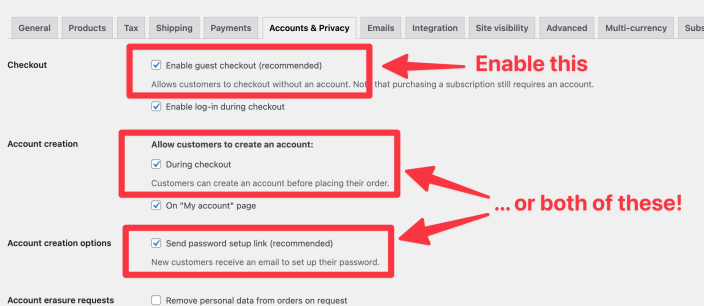 - Ensure one of the following combinations of settings are configured in WooCommerce > Settings > Accounts & Privacy: