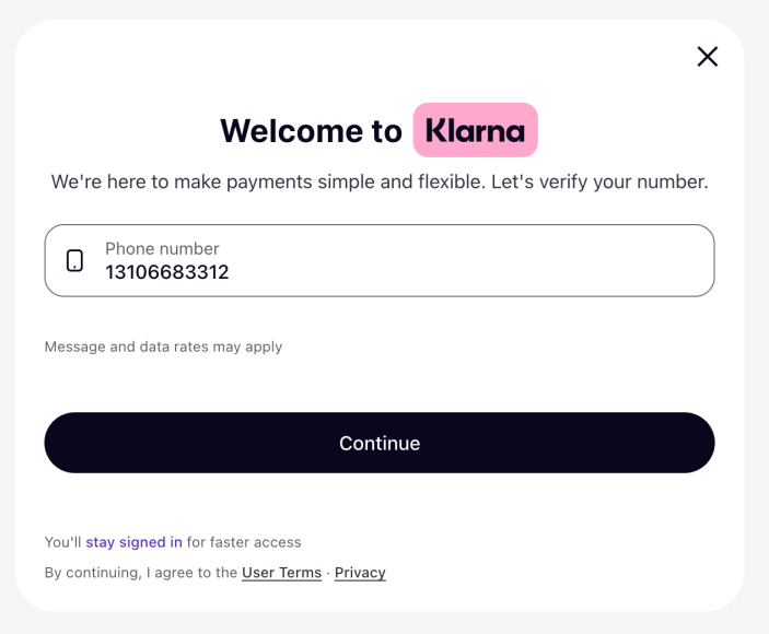 Enter a phone number from the Klarna test data and click Continue. For the SMS verification code, enter any six digits except for 999999.