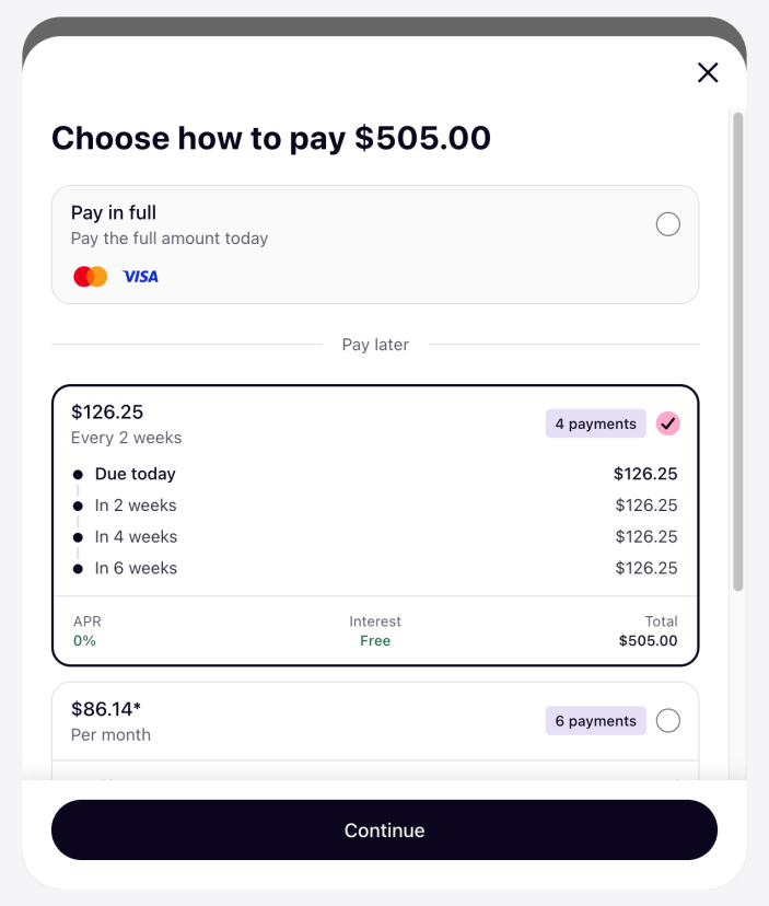 NOTE: BNPL providers will offer various payment plans to your customers depending on the purchase amount, the customer’s location, and other factors. Since merchants are paid in full as soon as the order is placed, the details of the customer’s payment plan (mostly) do not impact you.