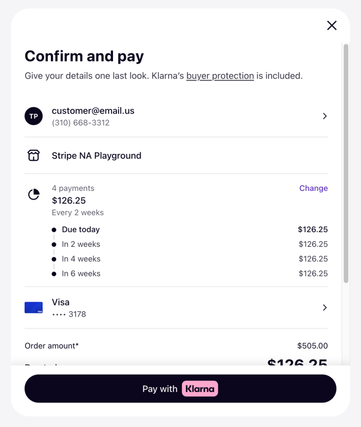 ↑ Back to topIn addition to paying over time, Klarna sometimes offers certain customers the ability to pay the whole order amount immediately. This occurs after the customer has selected the Klarna payment method.