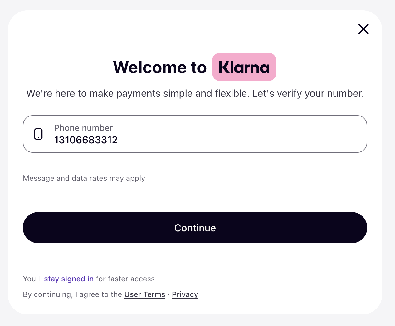 Enter a phone number from the Klarna test data and click Continue. For the SMS verification code, enter any six digits except for 999999.
