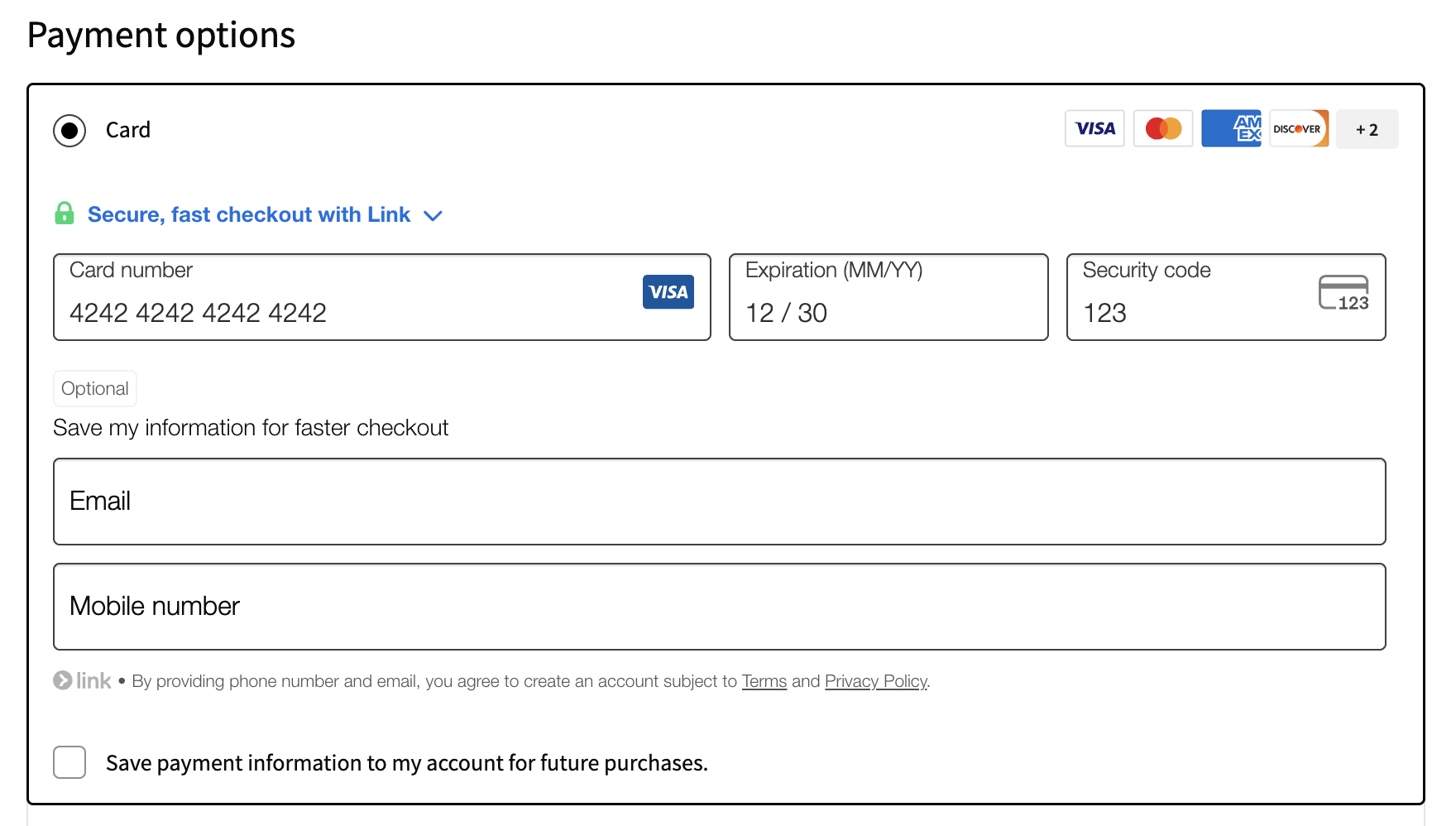 ↑ Back to topIf a customer doesn’t already have Link account, they can opt to create one during the checkout process by entering their email and phone number into the Link interface.
