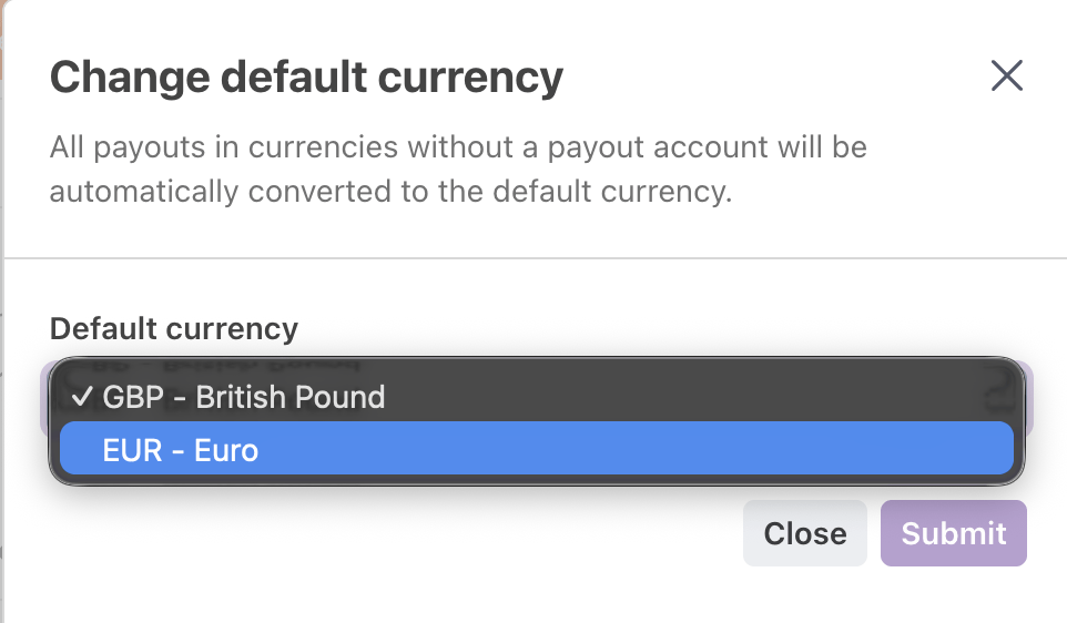 When using multiple bank accounts, one must be chosen as the default. If you take a payment in a currency that doesn’t match the currency of one of your bank accounts, it will be converted into your default currency and paid out into the default account.