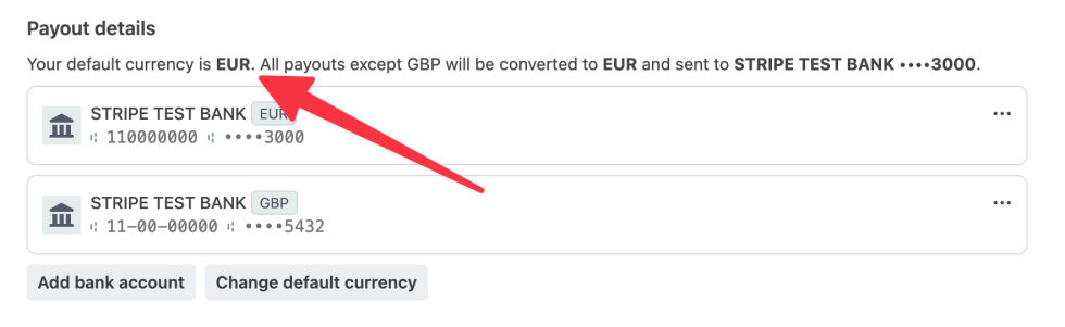 To set your default bank account, begin by following the same instructions as above to add at least one additional bank account. After you’ve added multiple accounts, you can change the default by clicking Change default currency and picking which currency you would like to use as the default.