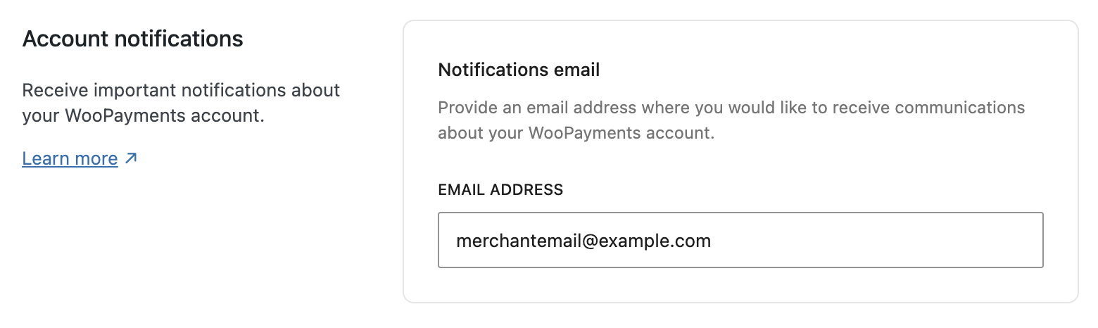 ↑ Back to topWooPayments sends various notifications to you via email, e.g. about disputes and so on. The Account notifications setting controls which email address we use for those.