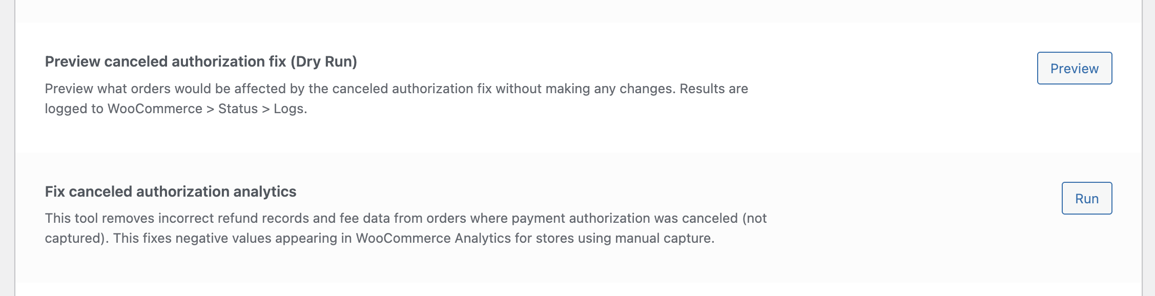 If you wish, you can use the “dry run” version of the tool first to see which orders will be affected but without altering any data. To actually run the tool and change any affected data, click the Run button for Fix canceled authorization analytics.