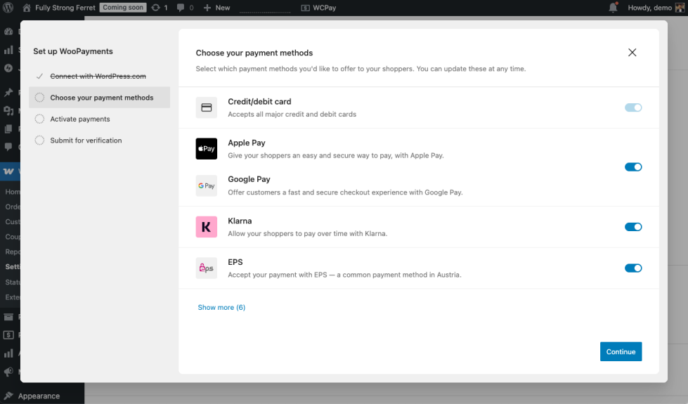 - Select which payment methods you’d like to enable and select Continue. You can adjust the available payment methods later in the WooPayments settings.