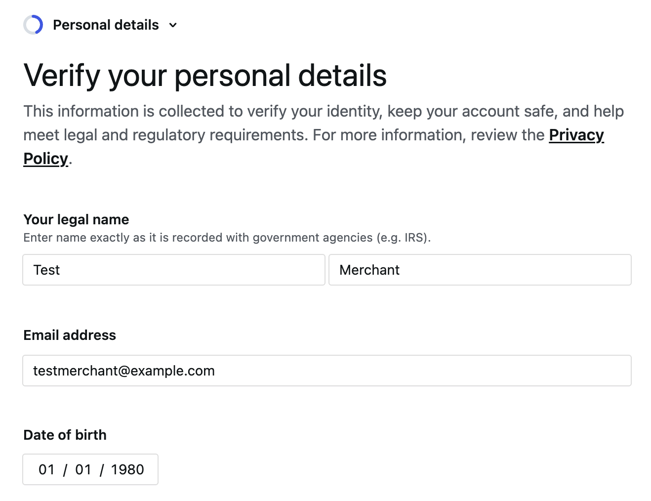 Note: Selecting Test payments will create a test account, which will allow you to safely test payments in a sandbox-like environment. However, you cannot accept real payments with a test account.