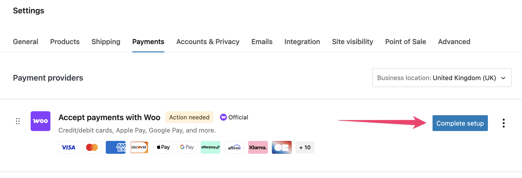 ↑ Back to topOnce you’ve finished signing up, go to the Payments > Settings section of your WordPress dashboard. This is where you can configure WooPayments.