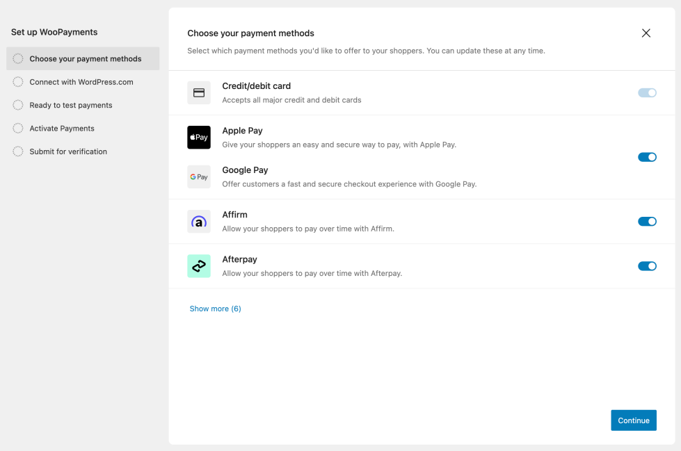 ↑ Back to topThis section shows features which enable even faster checkouts. Enabling these can boost your sales and reduce abandoned carts, as they make it easier for customers to buy. WooPayments currently supports WooPay, Apple Pay, Google Pay, and Link by Stripe.