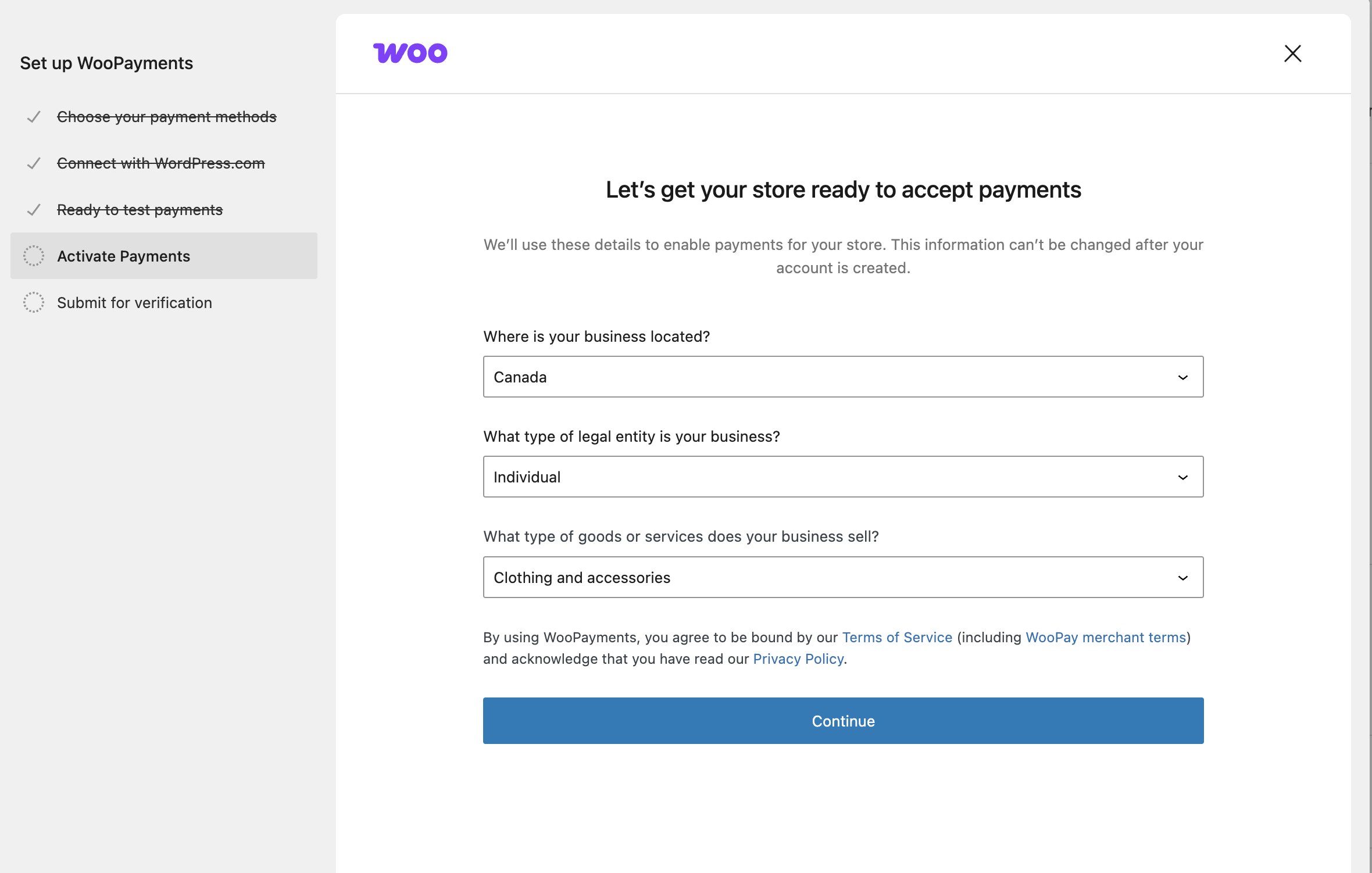↑ Back to topAfter you’ve installed and activated WooPayments, it’s time to start the sign-up process. Before doing so, keep the following information in mind: