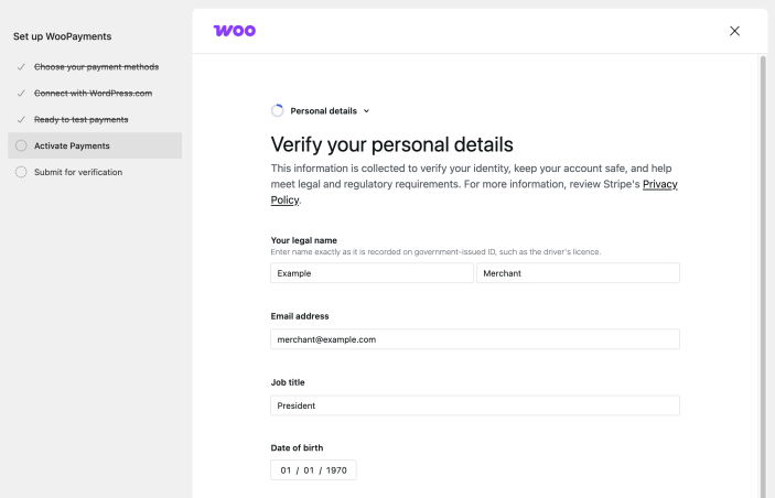 NOTE: As of WooPayments version 6.0.0 or later, some merchants will go through an experimental signup process called gradual signup. This involves verifying some information on your site first, before being taken to Stripe’s signup form. Please see the link above for more information on this experiment.