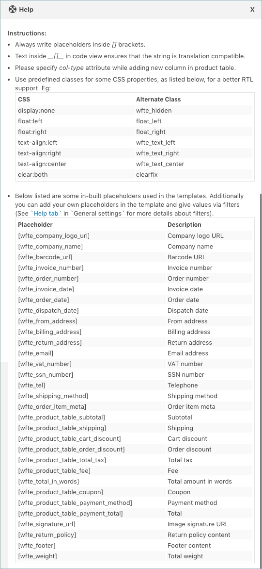 - While making changes via code editor it would be better for you to refer the help which briefs about placeholders, alternate classes for RTL support, etc as shown below: