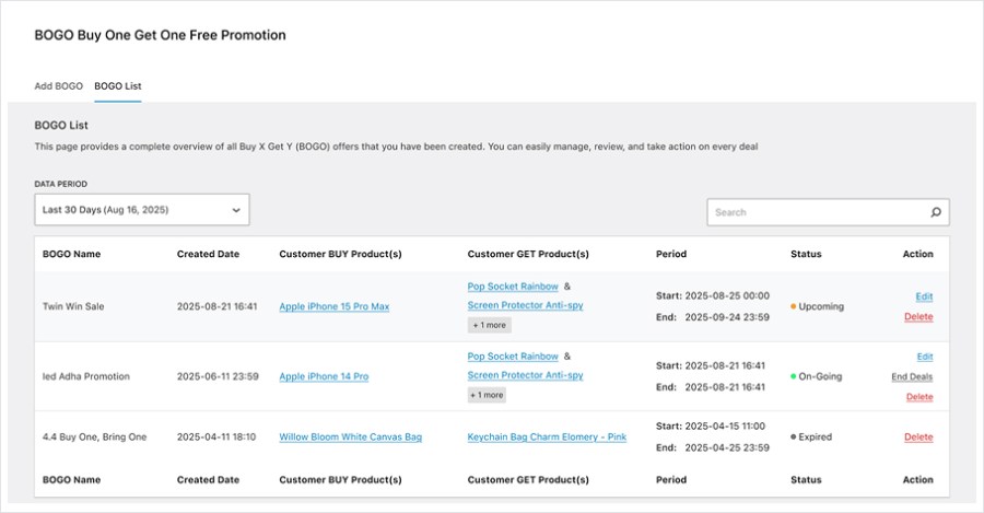 View and track all active, upcoming and expired BOGO promotions you have set before. You can edit, delete, or even ends the on going deals directly on the history list columns.