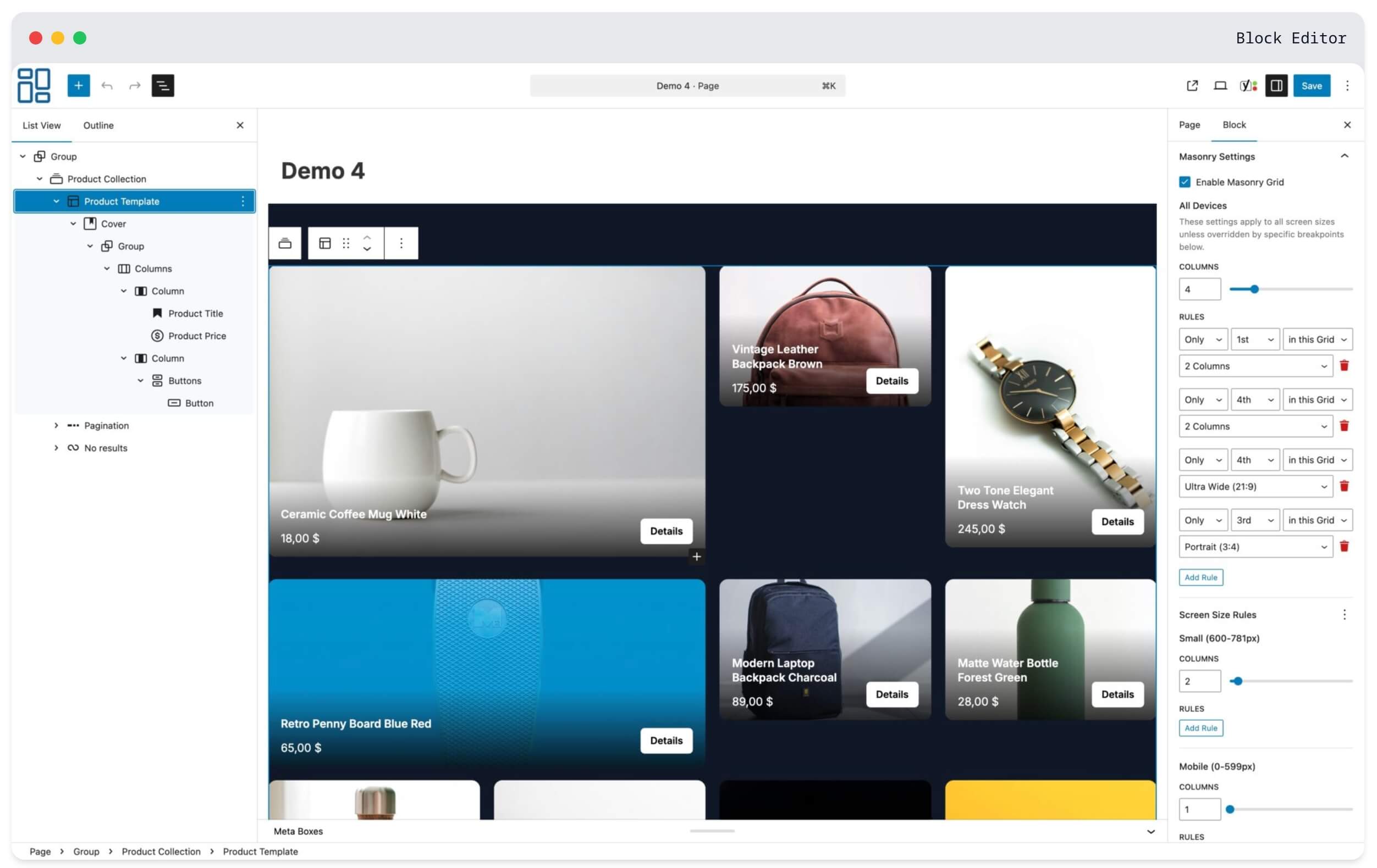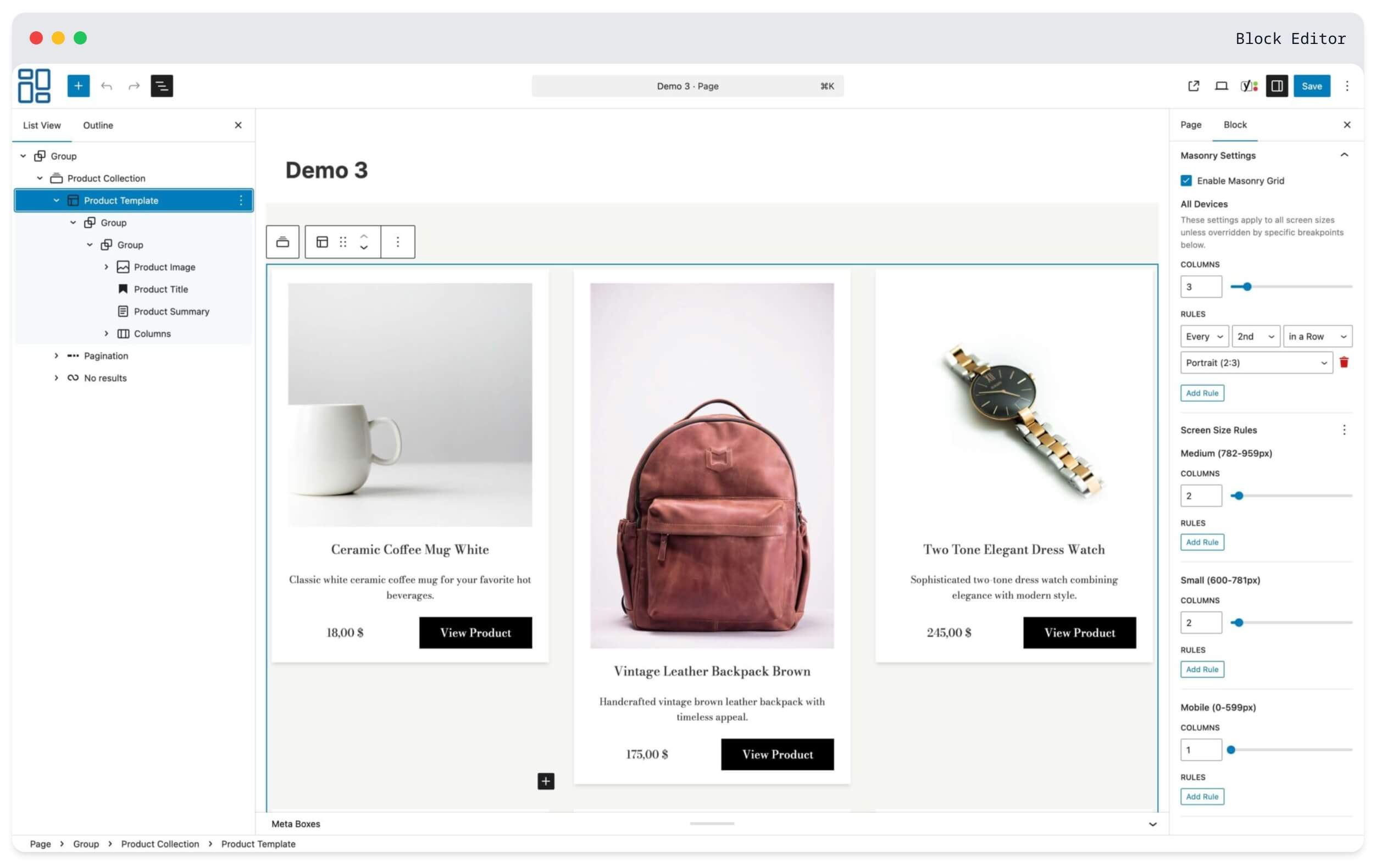 Product Collection Masonry is not a replacement. It enhances the native WooCommerce Product Collection block through standard WordPress controls.