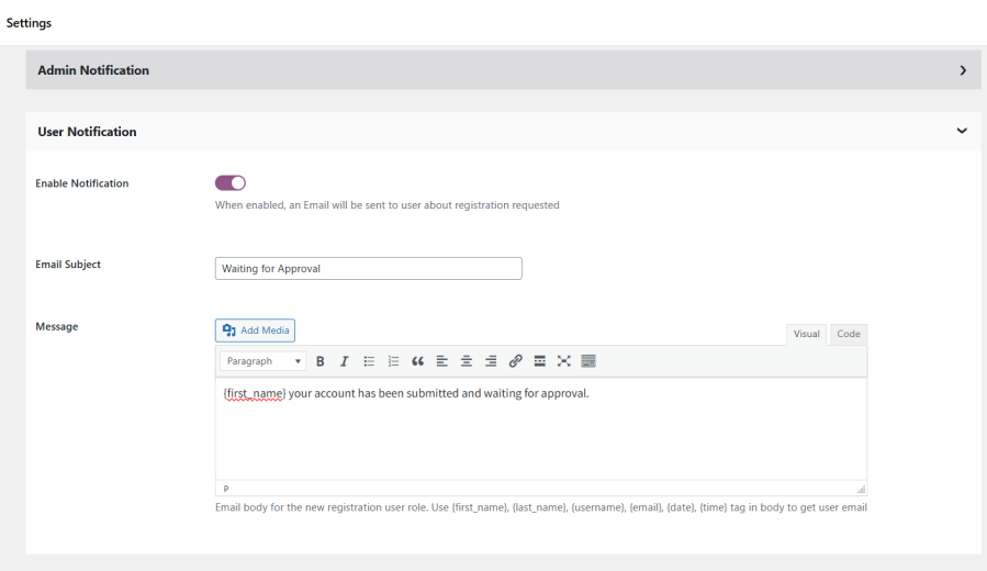 Supports dynamic placeholders: {first_name} {last_name} {username} {email} {date}