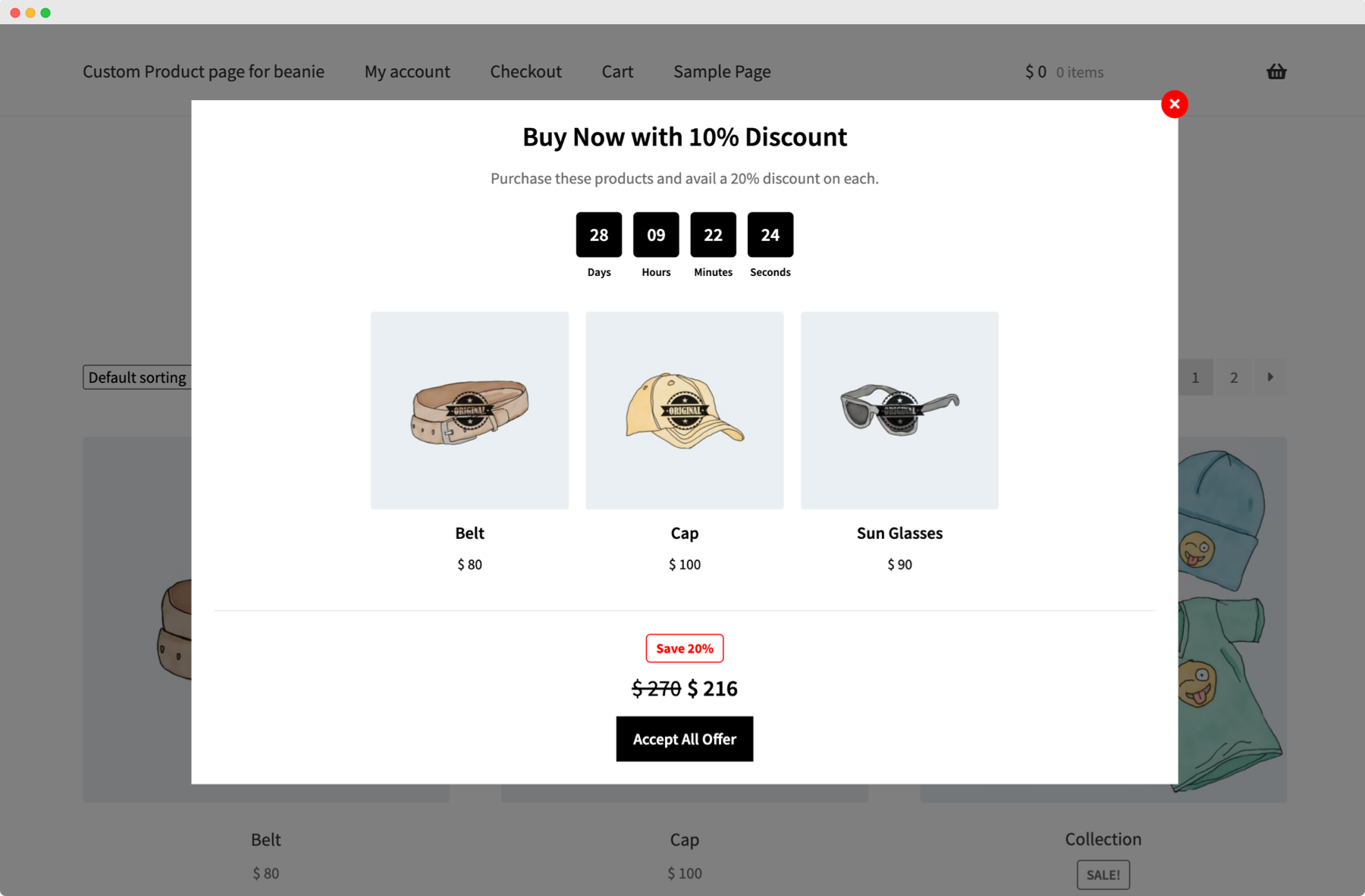 Instead of creating individual product offers, you can combine multiple products to create a bundle deal. The customers will have to purchase all products in the deal to receive the discount, removing any deal product from cart will remove the deal discount as well.