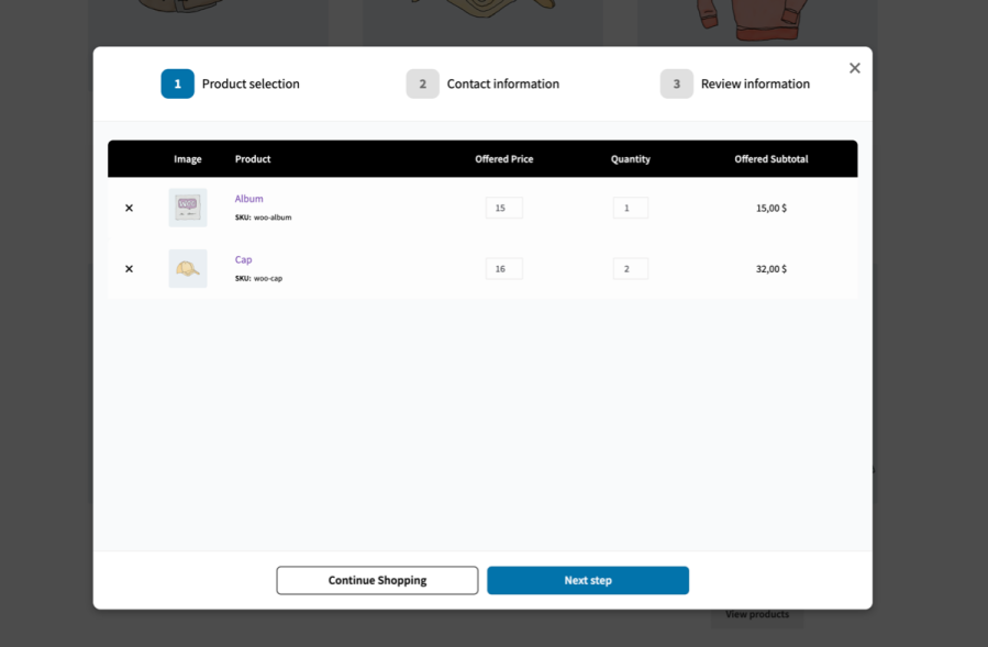 You can also hide prices and replace the “add to cart” button with the quote button. This feature comes in handy when you want to hide prices for wholesale, retailers, and other B2B customers and force them to ask for price estimates. You can choose to enable the offered price column to let customers add their offered price for each product in the submitted quote.