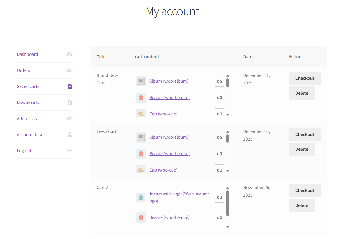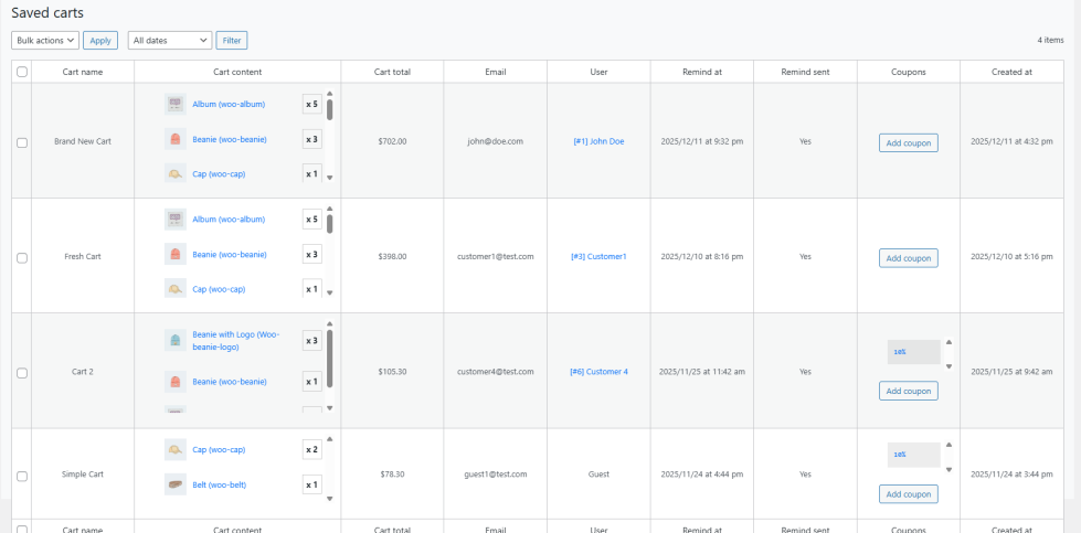 Store owners get a complete overview of saved carts from the admin dashboard: