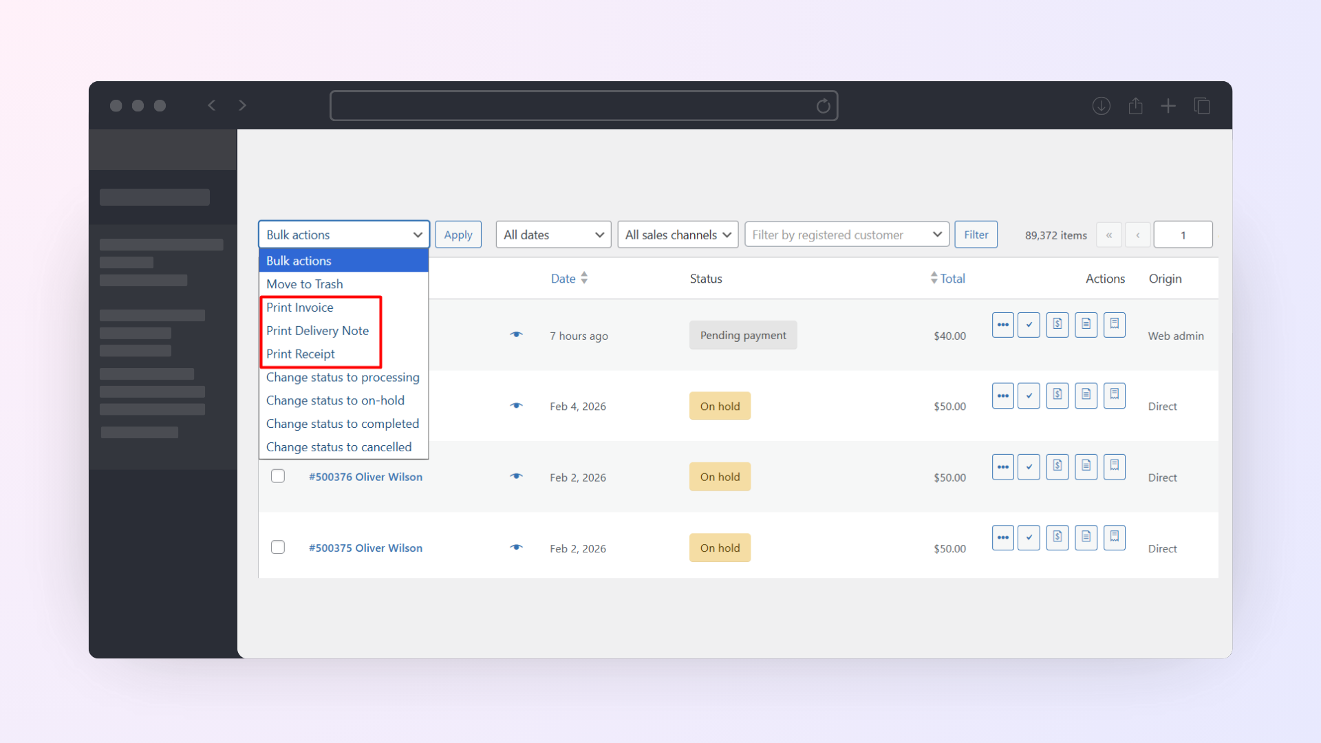Yes. The plugin supports printing order invoices in bulk. You can select multiple orders from the WooCommerce Orders page and use Bulk Actions to print invoices, delivery notes, or receipts for all selected orders at once.Â