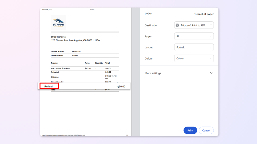 When an order is refunded, the refunded amount is shown on the invoice, and you can still access and print it.