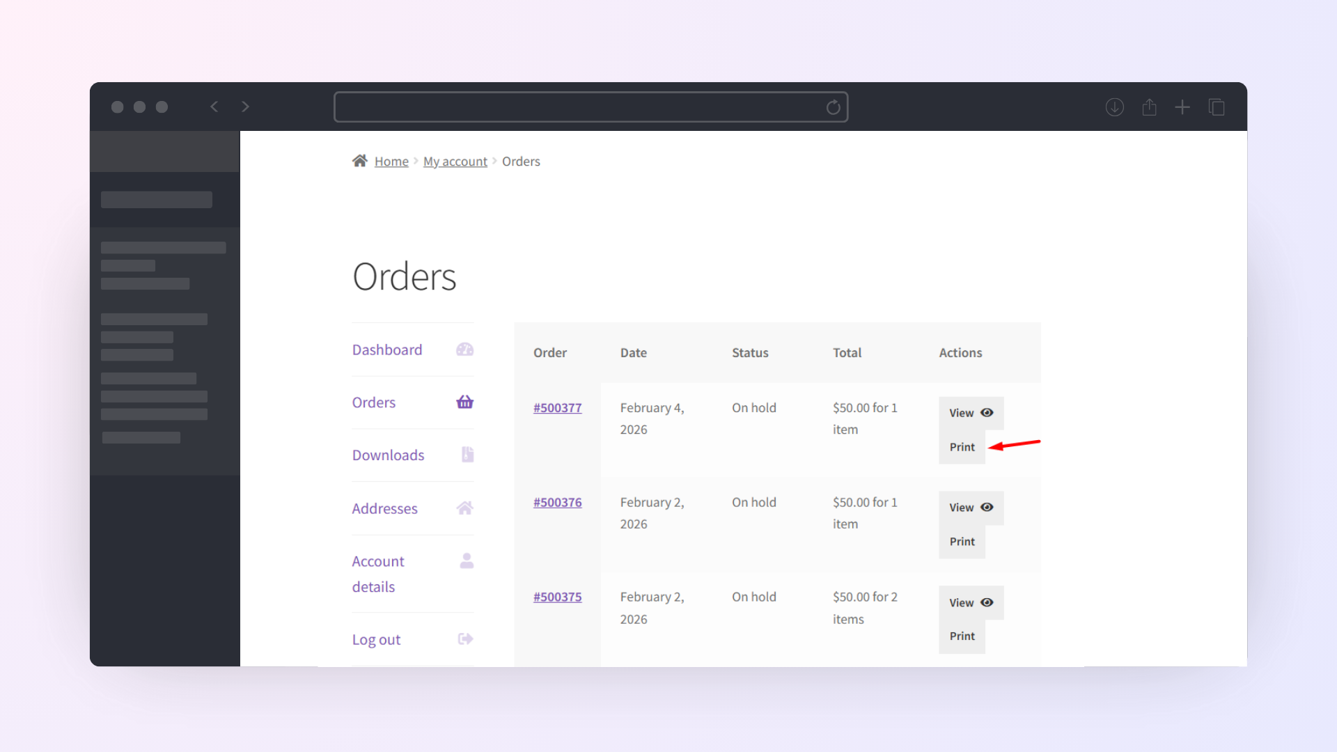 Yes. Customers can access and print their invoices and receipts from My Account → Orders. You can show print buttons on both the My Account page and the individual View Order page.
