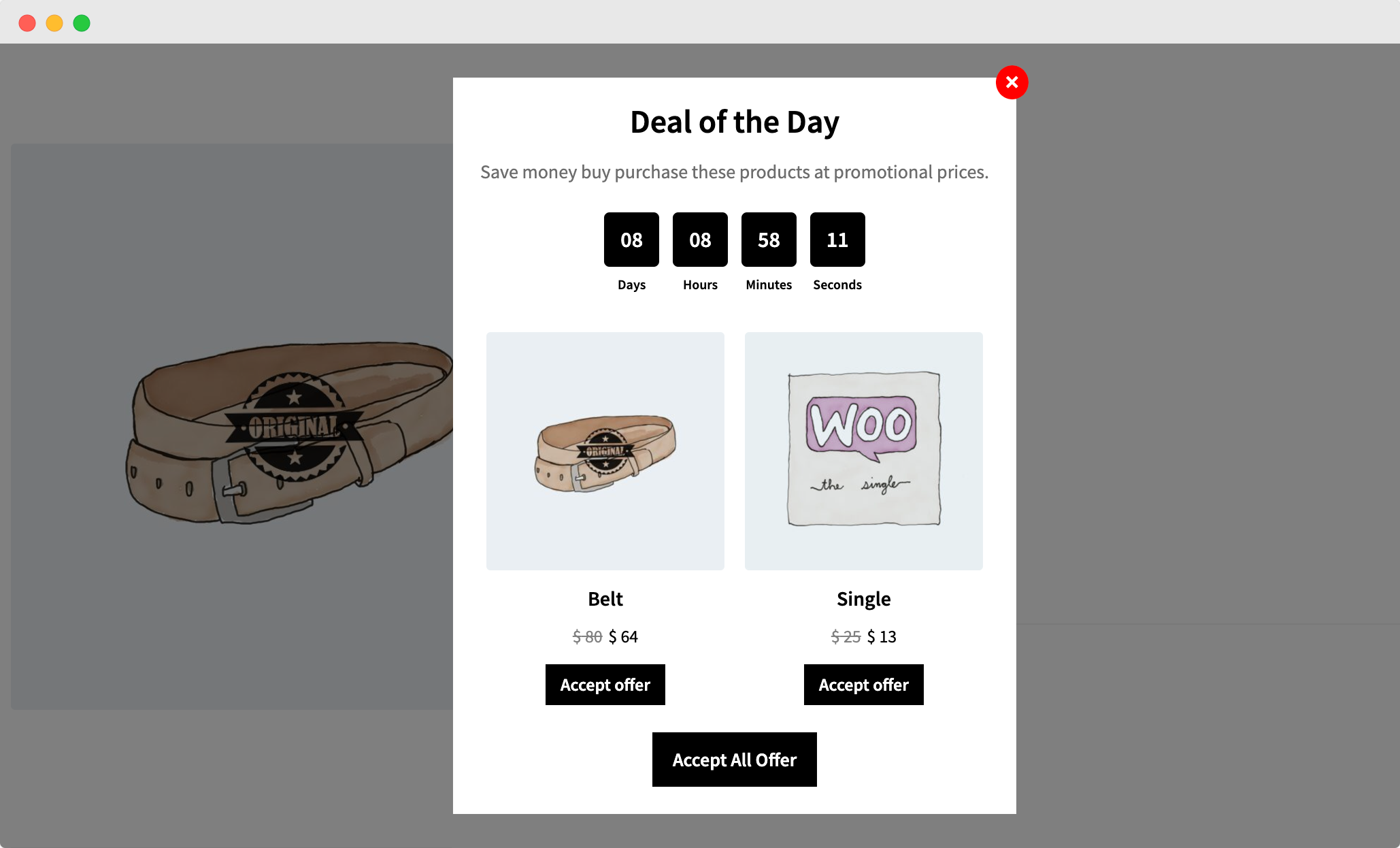 Display a countdown timer to create urgency in customers’ minds. Include a simple accept offer button to let customers conveniently add promotional products to their cart. Following are the details features of this extension,