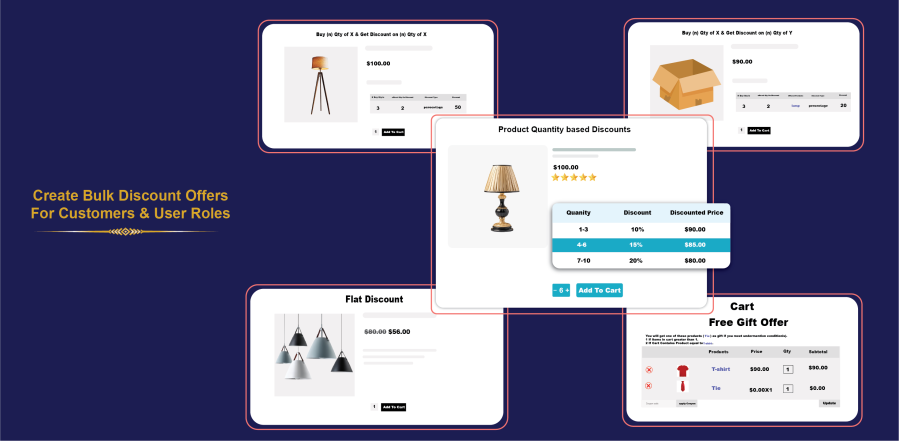You can offer flat discounts on the entire shop, selected products, or categories using the flat-discount option. You can restrict discounts to specific user roles—a useful feature for B2B store owners. The plugin displays a table on product pages, to encourage customers to buy and informs them about discount offers.