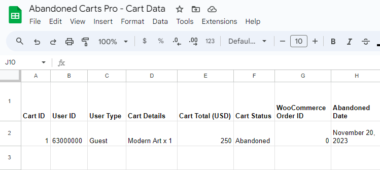 Export abandoned cart details and recovery to Google Sheets for advanced tracking
