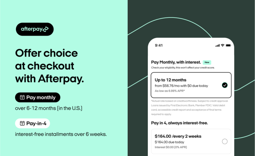 Afterpay allows customers to purchase products and choose to pay in four installments over six weeks or pay monthly (US only).