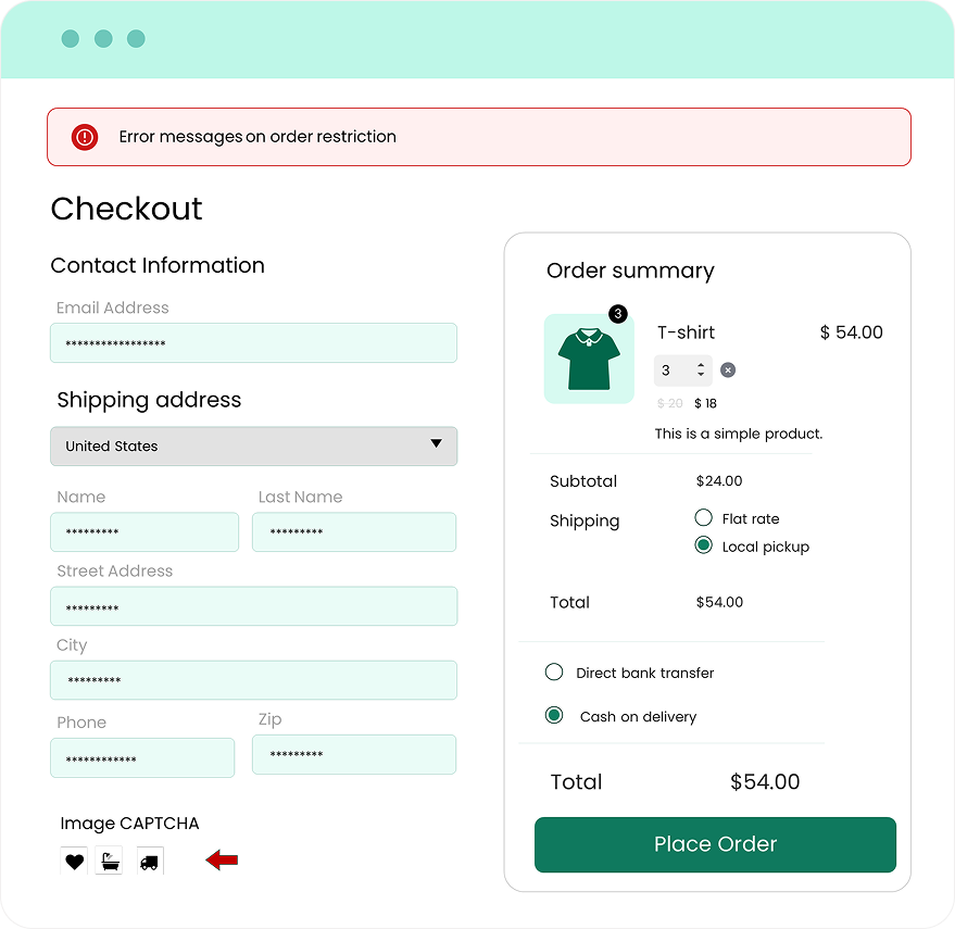 Apart from built-in fraud prevention features, this extension is fully compatible with Google recaptcha for woocommerce for extra checkout protection. In addition to Google recaptcha, this extension contains a built-in image CAPTCHA for additional security.