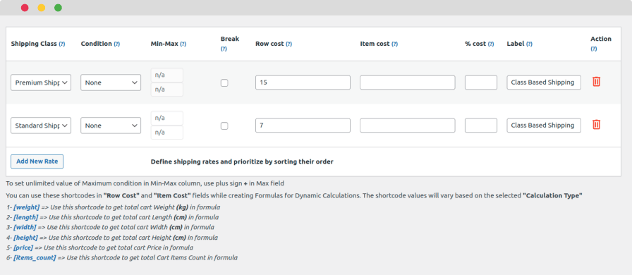 You can define multiple shipping rates for a shipping method using Conditional Shipping Rates, allowing you to apply various conditions based on product weight, dimensions (length, width, height), price, item count, and more. These conditions can also be set for specific shipping classes