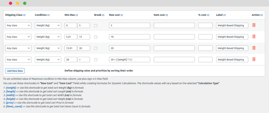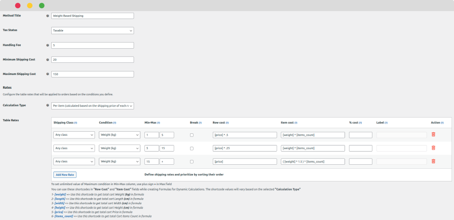 You can use different shortcodes to create formulas in Row Cost and Item Cost to calculate shipping dynamically.