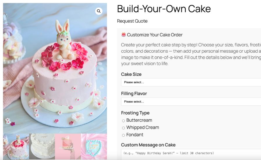 Customers browse your custom order products like any other product. When they click "Add to Cart," they're prompted to fill out a detailed request form with their specifications before proceeding to checkout.