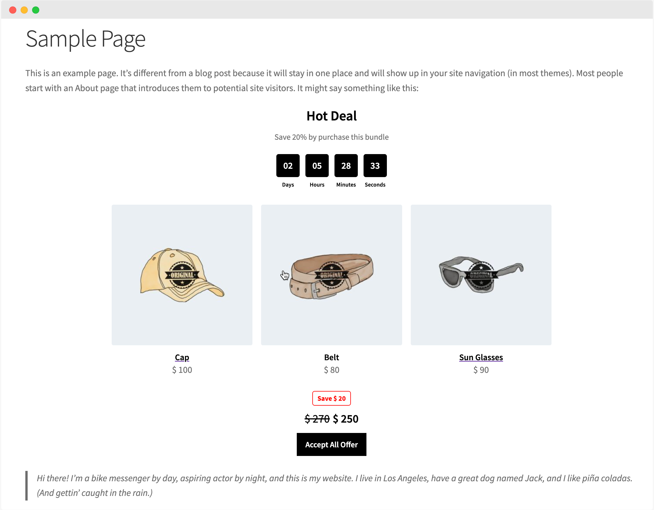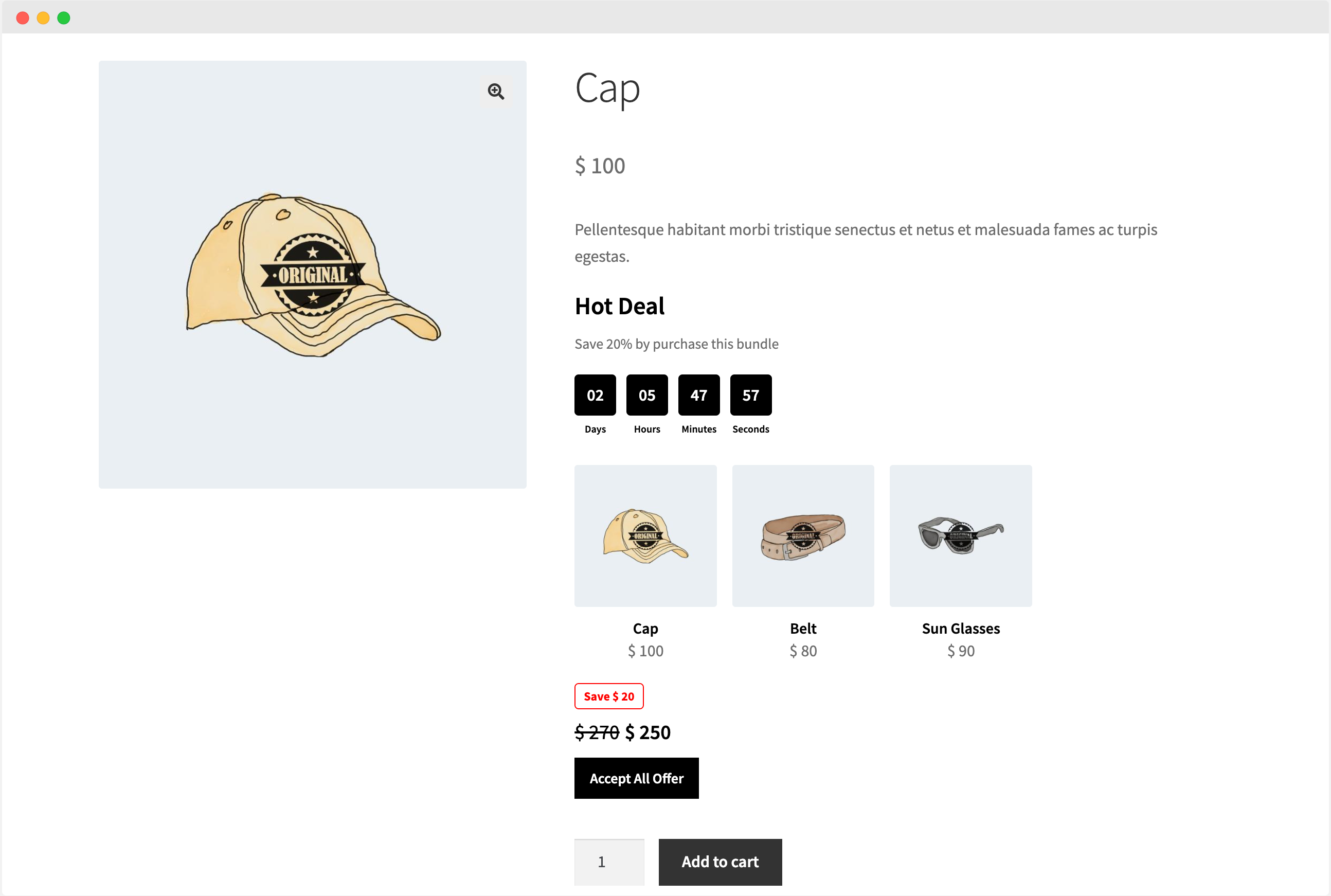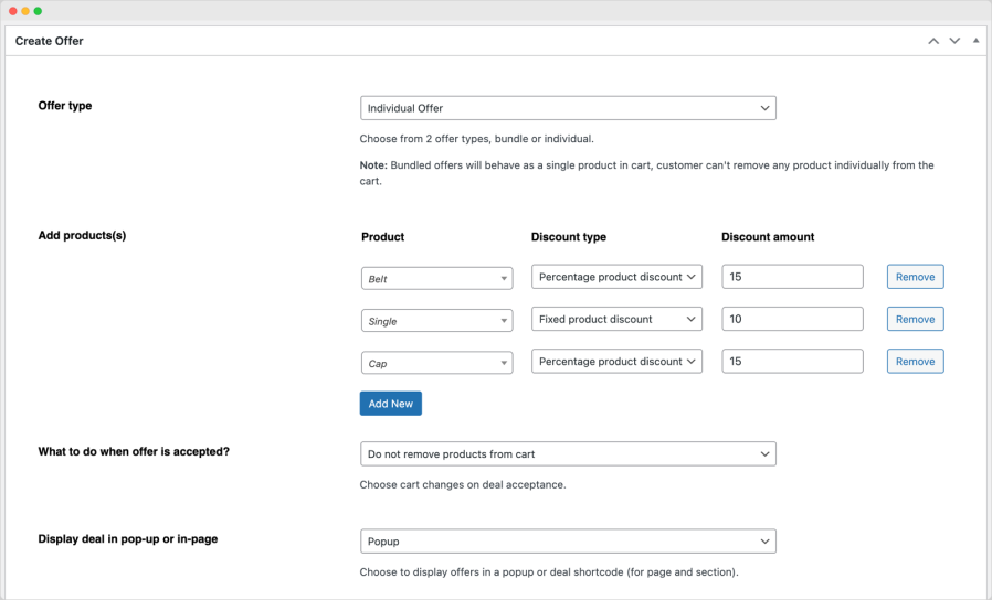 Instead of creating individual product offers, you can combine multiple products to create a bundle deal. The customers will have to purchase all products in the deal to receive the discount, removing any deal product from cart will remove the deal discount as well.