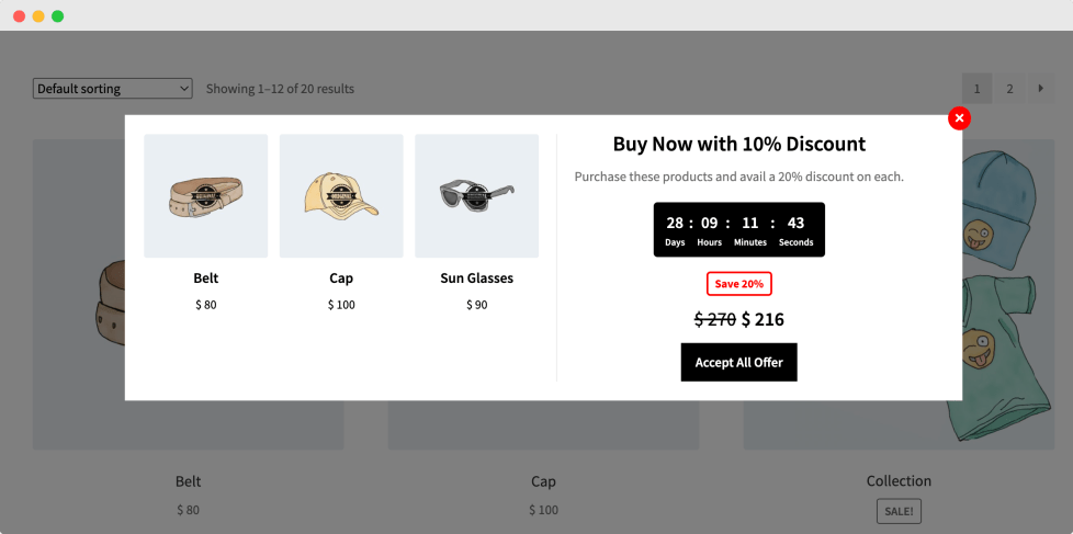Include a single or multiple products in the deal and specify discount in fixed or percentage amount. Choose from 2 different attractive templates to display deals anywhere on your website using popup or shortcode.