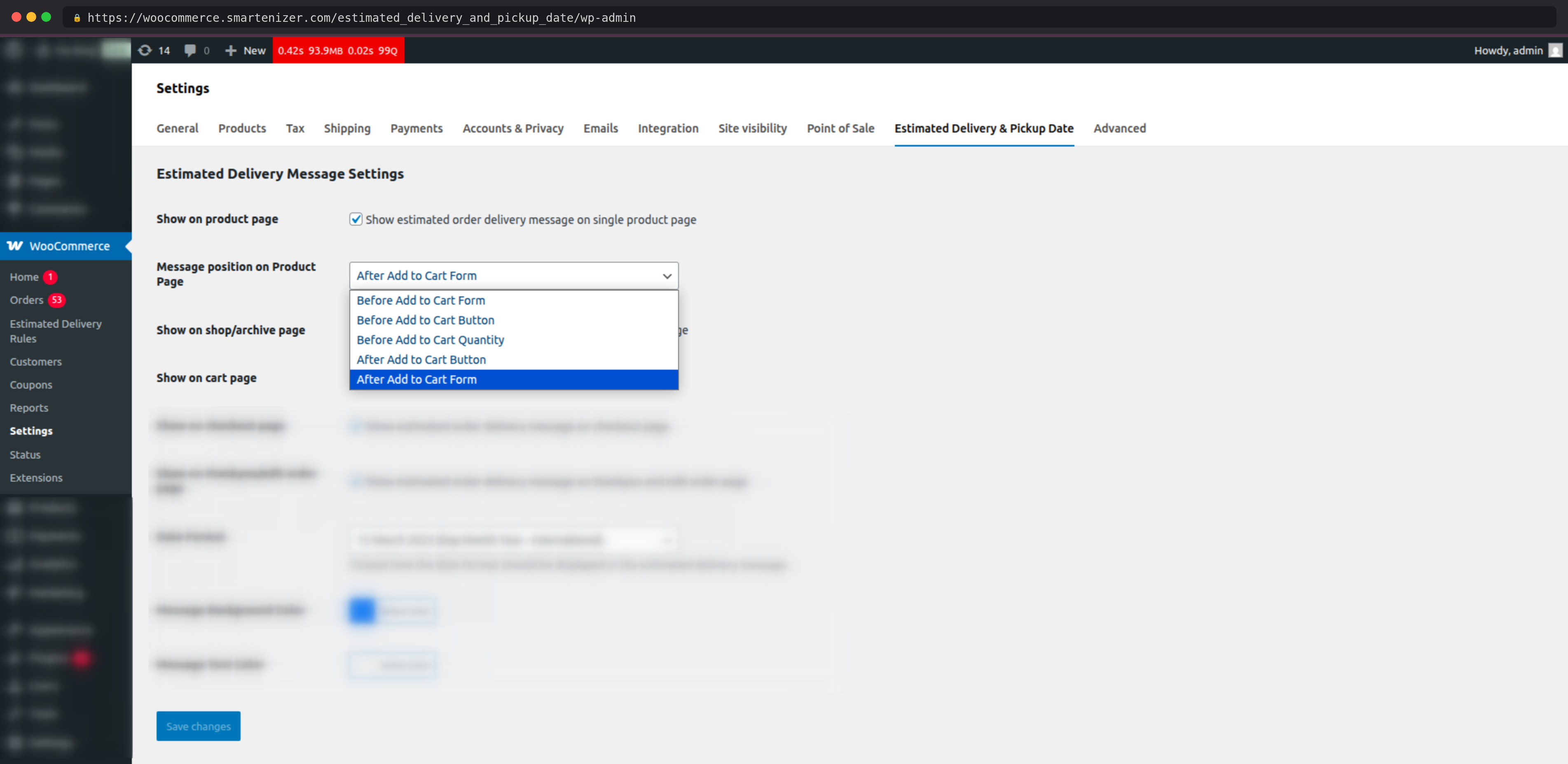 The delivery message can be displayed on five pages: the single product page, the shop/archive page, the cart page, the checkout page, and the order thank you page. Each page can be independently enabled or disabled from the plugin's General Settings.