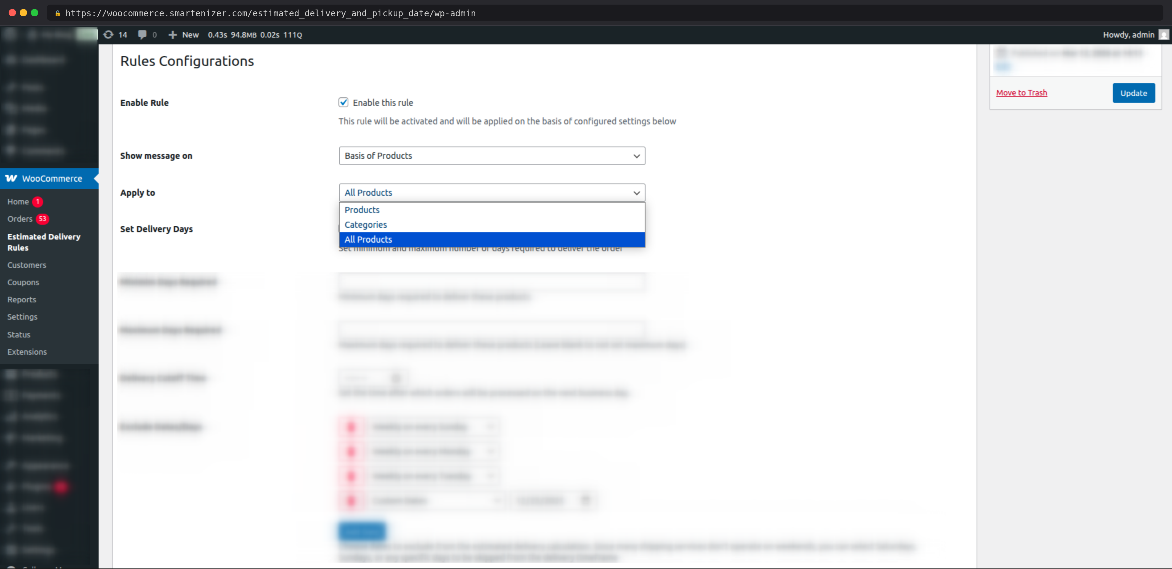 Yes. You can create separate delivery rules for specific products, specific product categories, or all products sitewide. Each rule has its own delivery day range, cutoff time, and excluded dates, so different products can show completely different estimated delivery windows.