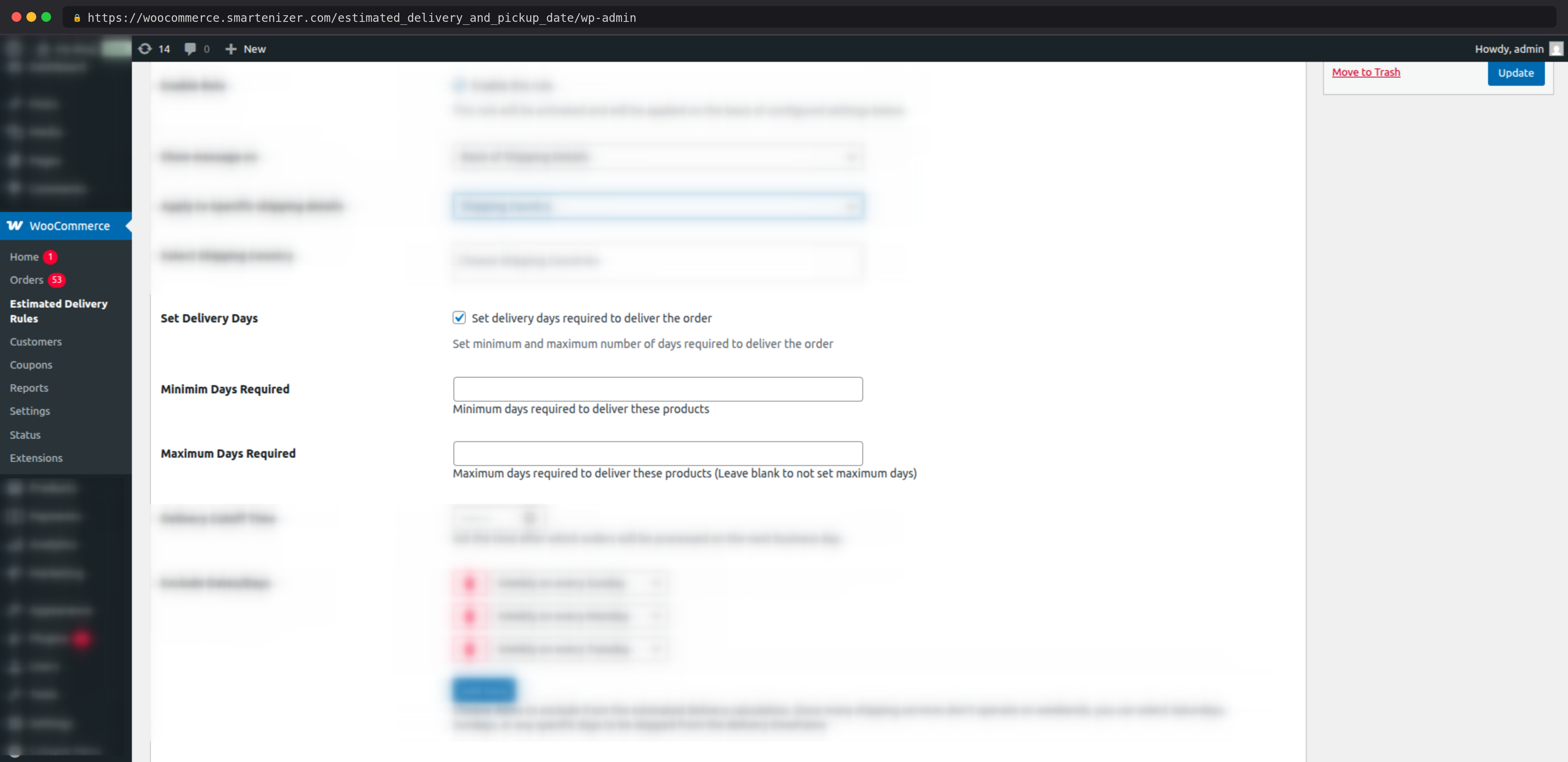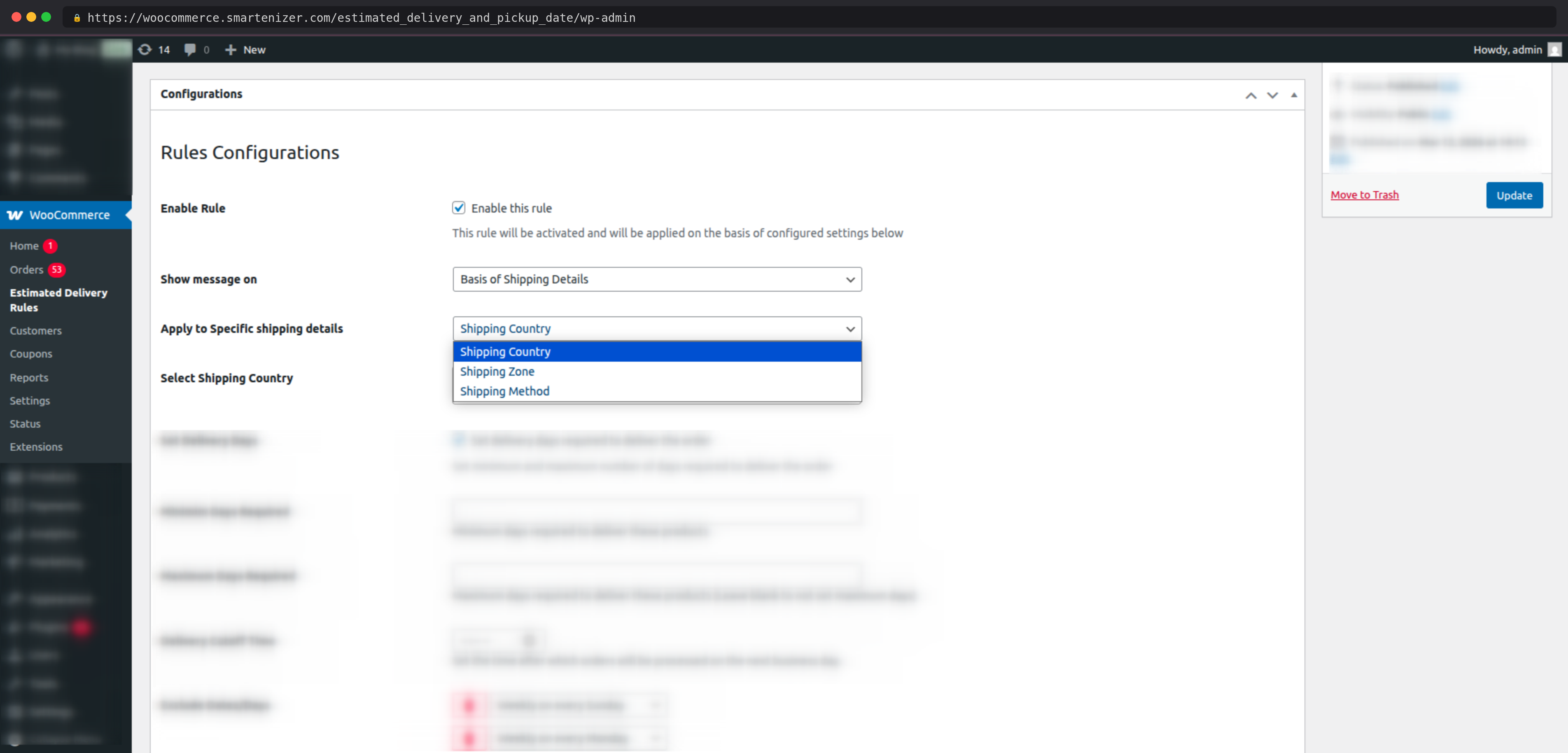 No coding is required. Every setting is managed through a visual rule builder in the WordPress admin panel using dropdowns, checkboxes, and color pickers. You can set up complex delivery rules with cutoff times, excluded holidays, and shipping zone targeting without writing a single line of code.