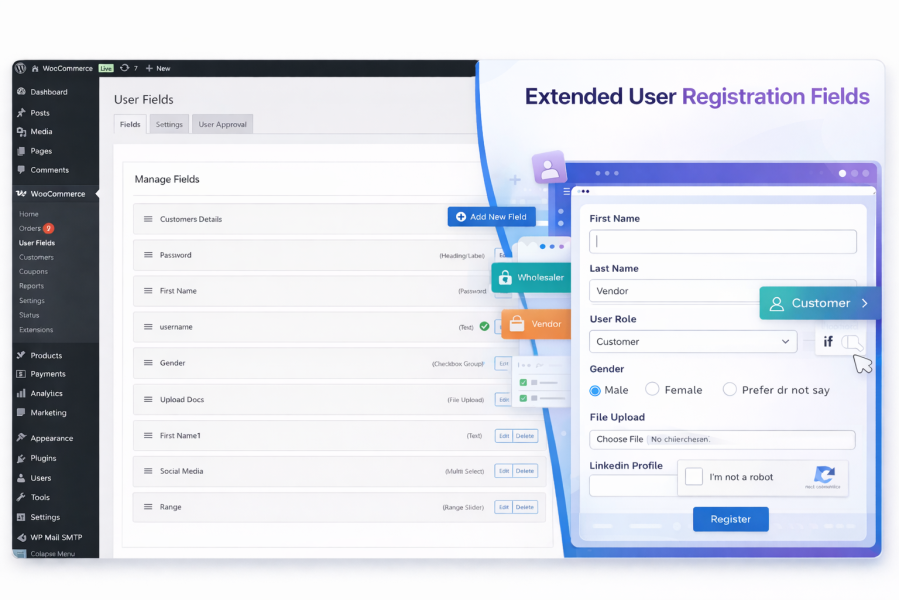 Extended User Registration Fields for WooCommerce is an advanced WooCommerce registration form plugin that lets you add unlimited custom user registration fields, manage user roles, apply conditional logic, and control user approval workflows—all fully integrated with WooCommerce.