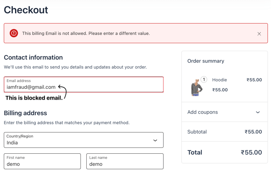 Configure to protect your WooCommerce store by blocking fraudulent orders automatically. Use smart filters like user email, name, and other identifiers to stop scammers before checkout.