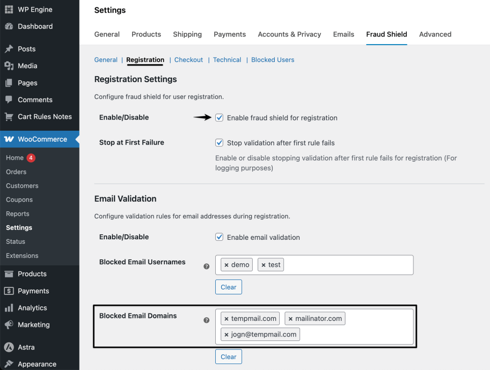 Fraud Shield for WooCommerce protects your store by blocking spam orders and fake user registrations. It validates user registration, billing, and shipping details, as well as technical fields such as IP address, device type, OS, domain, and subdomain.